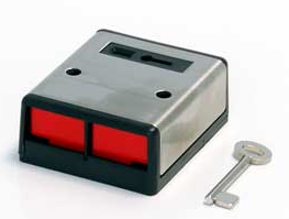 The double push latching panic / hold up button, both buttons must be pressed at the same time for the unit to latch, and can only be reset by key. This reduces the chance of false alarms. This unit has a stainless steel housing with a status indication window.